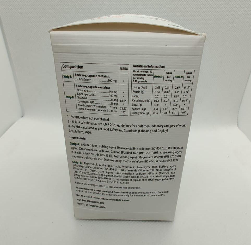 L-Glutathione, Vitamin C, Alpha lipoic Acid, Pycnogenol, Coenzyme Q10, Vitamin E & Veg Gelatin Capsule