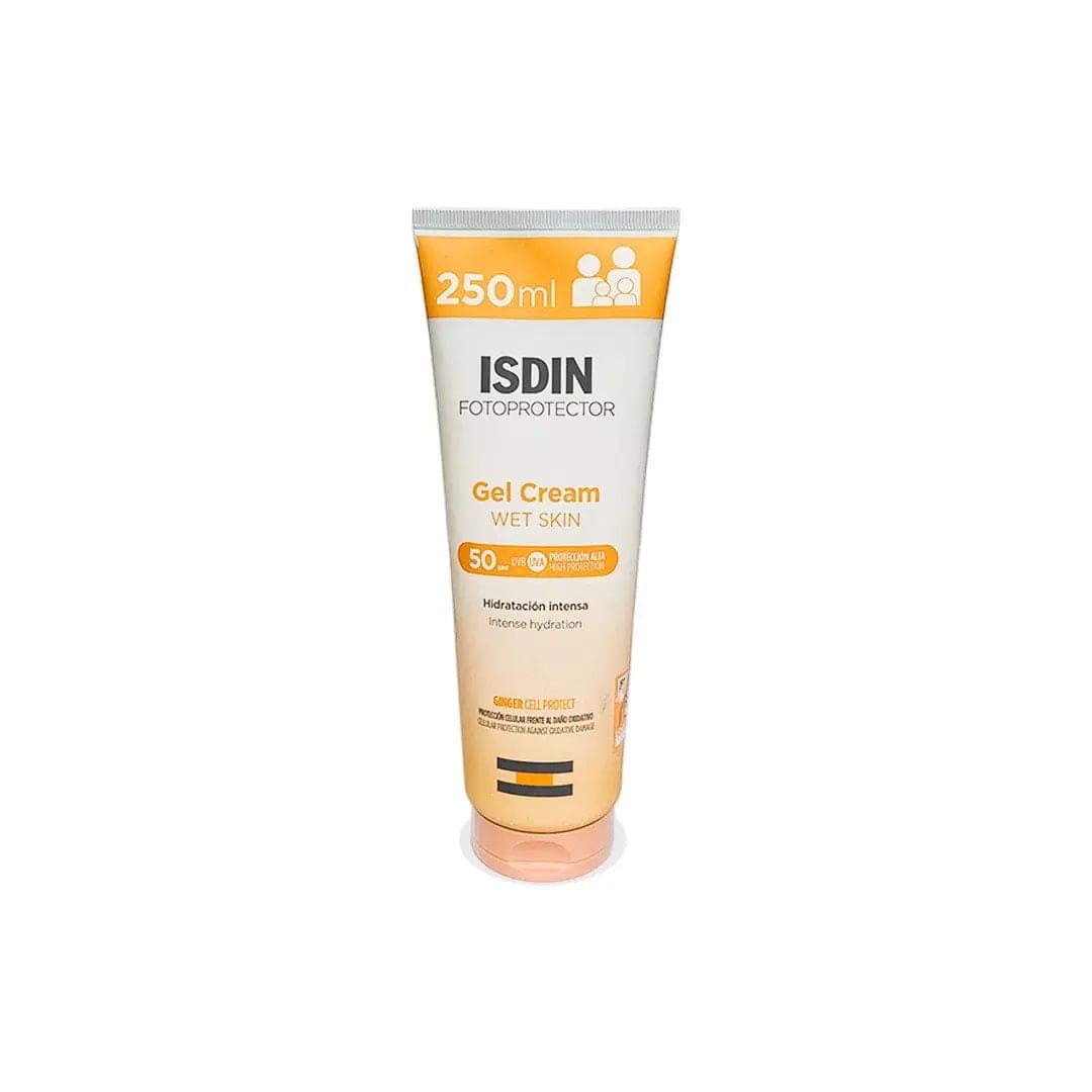 ISDIN Fotoprotector Gel Cream Wet Skin SPF 50 – 250 ml is an ultra-high‑protection sunscreen designed to hydrate and refresh. This innovative gel‑cream combines the refreshing feel of a gel with the moisturizing softness of a cream, delivering very high broad-spectrum SPF 50 protection, inclusive of UVA and UVB filters. The lightweight, water-resistant formula absorbs quickly—even on damp or wet skin—leaving a silky, shine‑free finish that feels cooling and non-greasy.