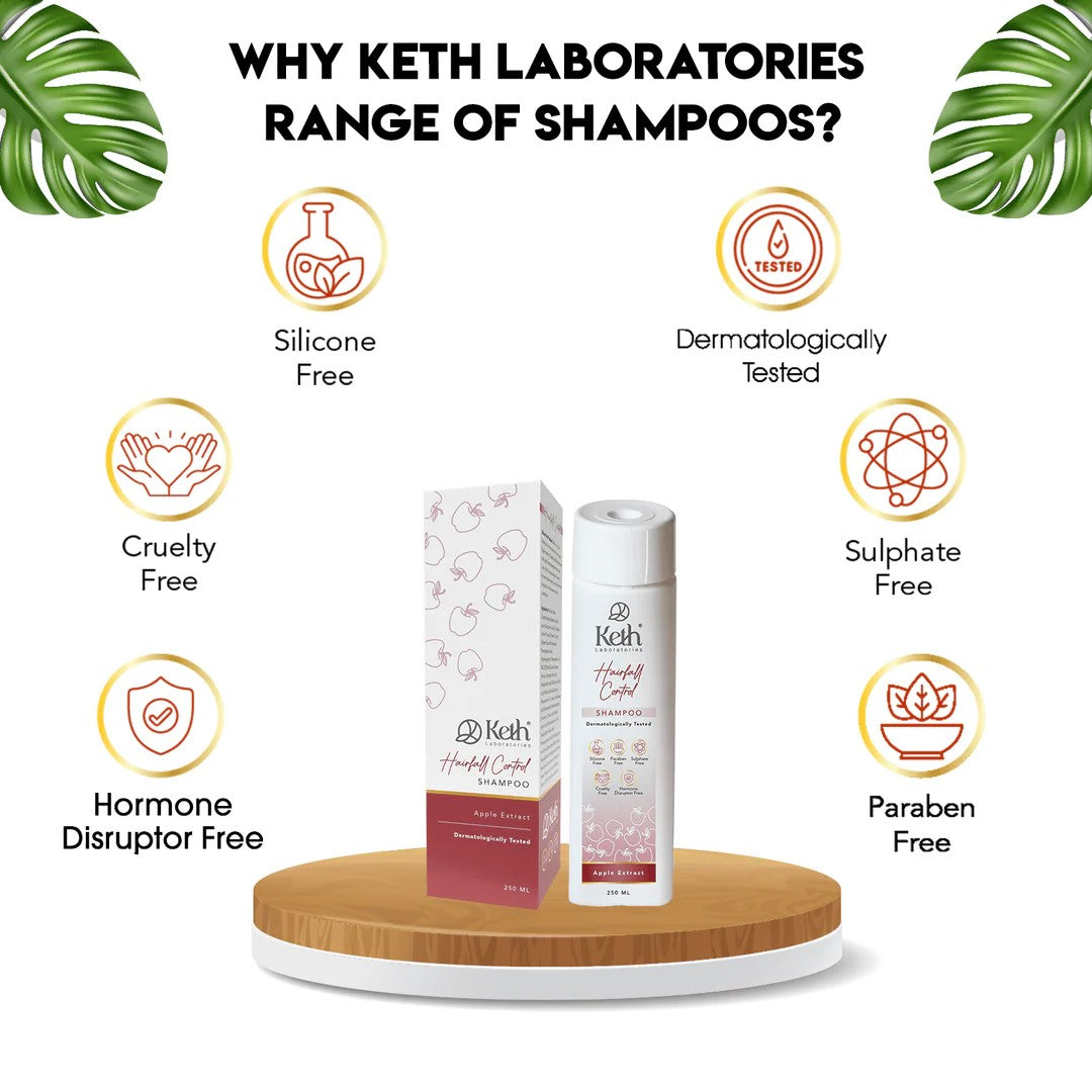 Keth's laboratories formulated sulphate and paraben hair fall control shampoo for men & women with a unique apple extract, palasha, and bhringraj mix that significantly strengthens your hair roots