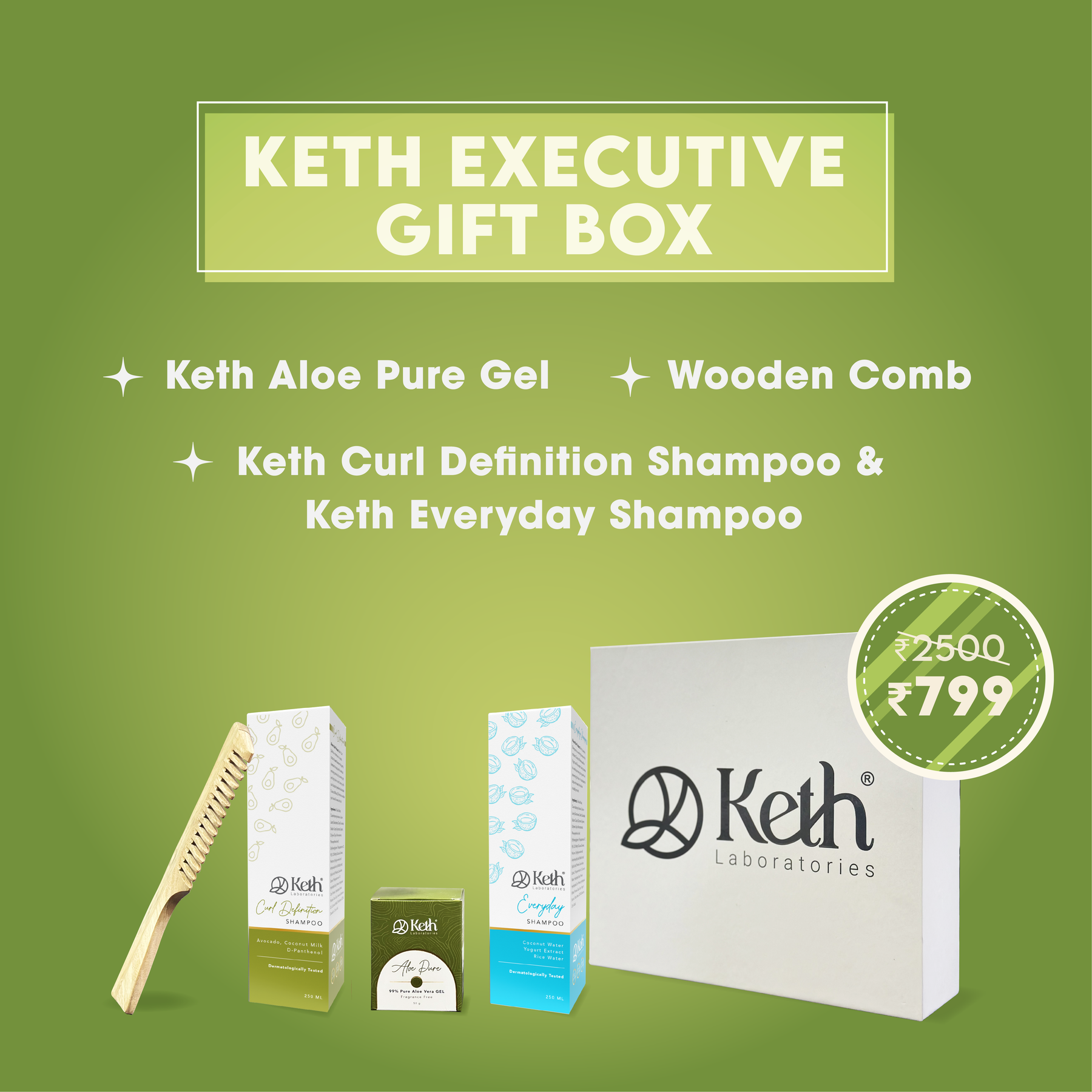 Enjoy defined curls with Keth Curl Definition Shampoo, daily freshness with Keth Everyday Shampoo, hydration with Keth Aloe Pure Gel, and easy detangling with a Wooden Comb.