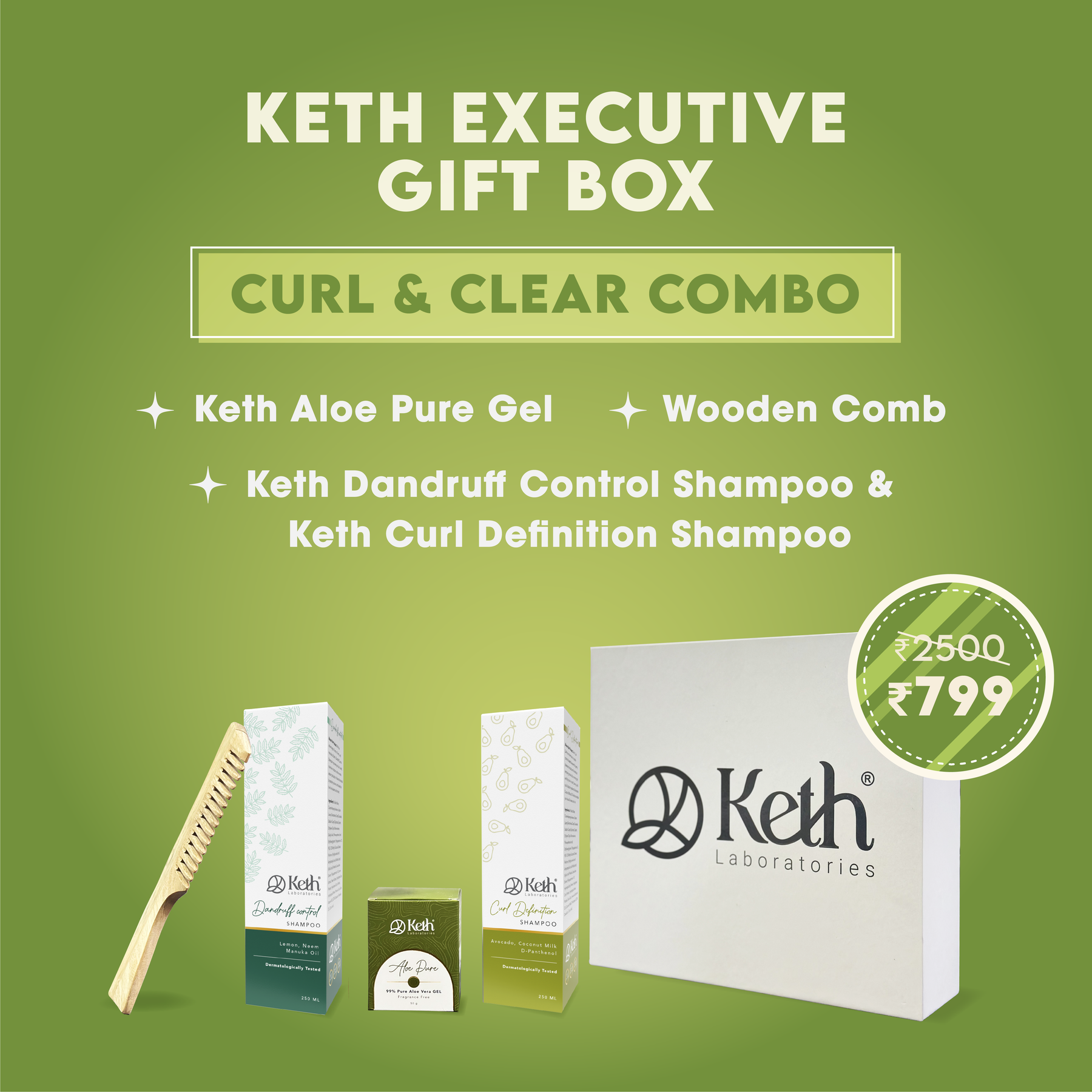 Enjoy defined curls with Keth Curl Definition Shampoo, dandruff relief with Keth Dandruff Control Shampoo, hydration with Keth Aloe Pure Gel, and easy detangling with a Wooden Comb.