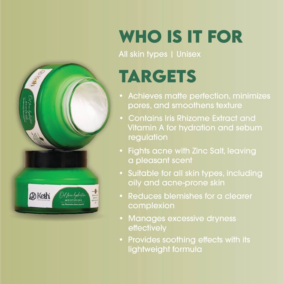 Revitalize your skin's moisture balance with Keth Laboratories Oil-Free Hydration Moisturizer. Formulated with Iris Florentina and Vitamin A, this moisturizer is specially crafted to deliver optimal hydration for those with oily and acne-prone skin.