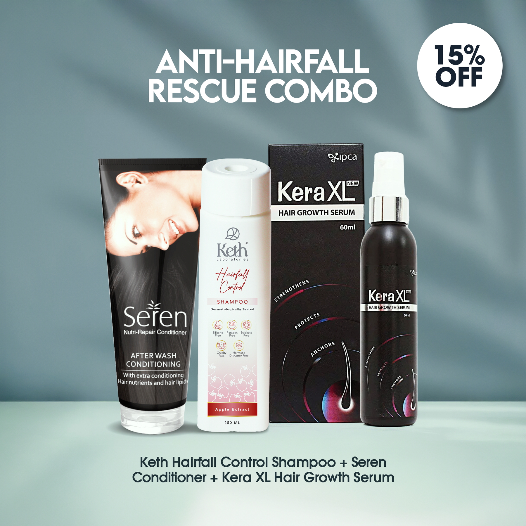 Experience stronger, healthier hair with the Keth Anti-Hairfall Rescue Combo – cleanse and fortify with Keth Hairfall Control Shampoo, condition and smooth with Seren Conditioner, and boost hair growth with Kera XL Hair Growth Serum.