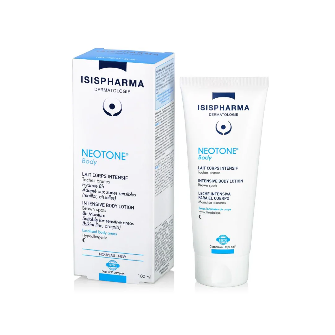 ISIS Pharma Neotone Intensive Body Lotion helps reduce dark spots and improve uneven skin tone. It contains the patented [DEPI-ACT] complex, which fades dark spots and prevents new ones. The lotion also has liquorice extract, a natural brightening agent, to make the skin look more radiant. With shea butter and niacinamide, it hydrates and nourishes the skin, leaving it soft and smooth. Its lightweight, non-greasy formula is suitable for all skin types, even for sensitive areas like the underarms and bikini line.