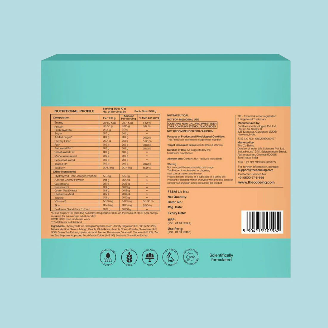 Hydrolyzed Marine Collagen, Hyaluronic Acid, Vitamin C, Biotin, Zinc, Amla Extract, Antioxidants, Natural Flavours, Stevia