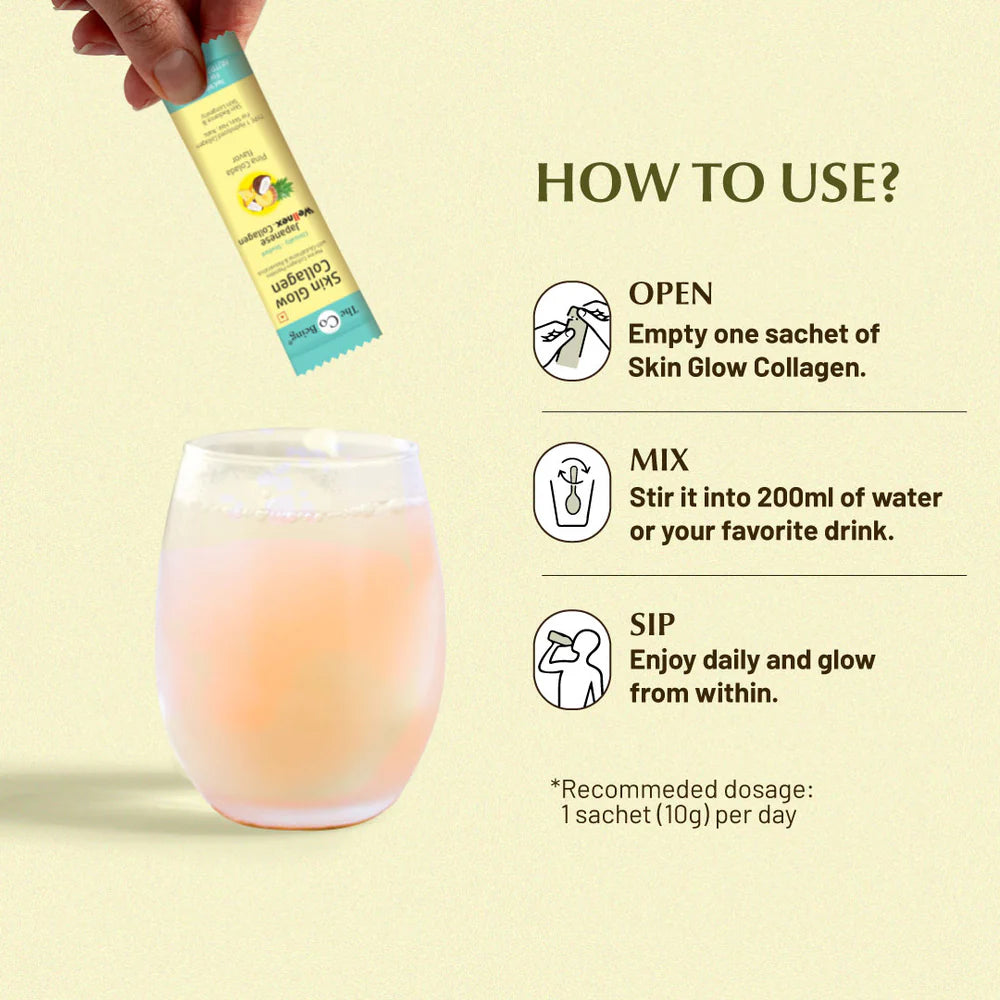 Mix 1 scoop (10g) in 150-200ml of water or juice. Stir well and consume daily. For visible results, use consistently for 8-12 weeks.